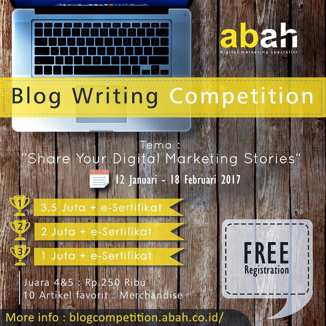 Lomba Menulis Blog SHARE YOUR DIGITAL MARKETING STORIES-Kamu jago nulis ? Biasa ngeblog dan senang dengan lomba ?. Nah, dengan semangat di awal tahun 2017 ini, ABAH Digital Marketing Specialist mengadakan Blog Writing Competition yang terbuka untuk umum dengan tema “Share Your Digital Marketing Stories”.